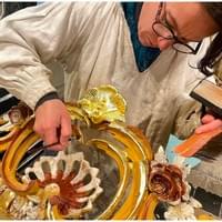 Quant à moi, en 2007, après avoir obtenu mon diplôme des métiers d'art et de décoration sur verre ( DMA ) au CERFAV (54), je me suis installée en tant que verrière et vécu à Toulouse jusqu'en 2019, puis j'ai rejoins Julien à Bordeaux. Depuis, il m'a transmis toutes les ficelles du métier de la dorure sur bois.
