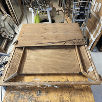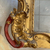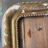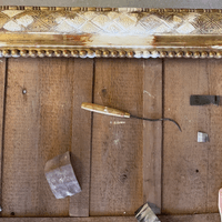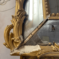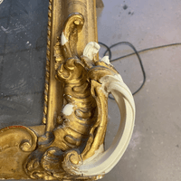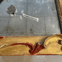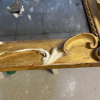 Assemblage du cadre & Remplacement de la traverse basse & Reconstitution des frises en stuc & Dorure à la détrempe et patine, Découpe d'un tain XIX & son montage sur le cadre & remontage du parquetage.